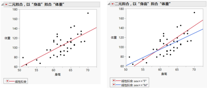 图 5.24中左侧的散点图中有一条回归线将体重和身高关联起来。右侧的散点图显示分别对应于男性和女性的回归线。