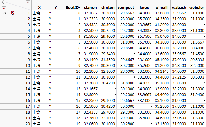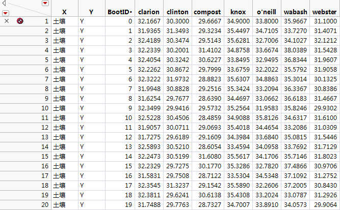 Bayes Bootstrap 结果表中没有缺失值。每个 bootstrap 样本中都包含 Snapdragon.jmp 数据表中的全部 21 行,这些行的 bootstrap 权重各异。