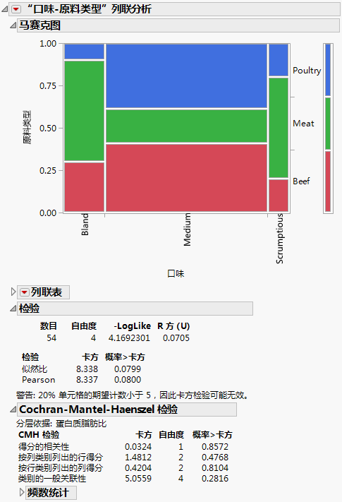 该示例使用 Hot Dogs.jmp 样本数据表。检查热狗类型和口味之间的关系。