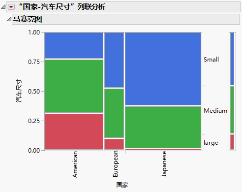 马赛克图是双因子频数表或列联表的图形表示法。马赛克图分为一些矩形,使得每个矩形的垂直长度与 X 变量每个水平中 Y 变量的比例成比例。马赛克图由 Hartigan and Kleiner (1981) 引入,后来由 Friendly (1994) 进行了改进。