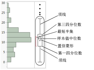 箱的两端延伸出有时称为须线的线条。须线从箱的两端延伸到如下距离内的最远数据点,这些距离计算如下: