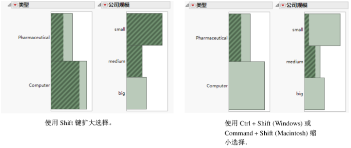 您可以看到小型和中型公司的类型分布。请参见图 3.13中的左图。现在缩小选择,假定您只想查看小型和中型医药公司。