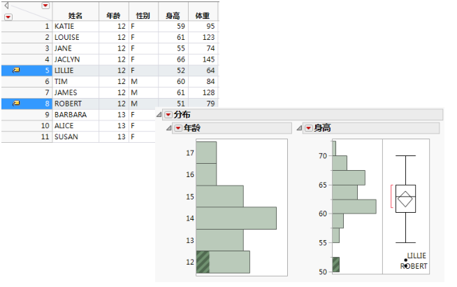 “分布”报表窗口是交互式窗口。点击某个直方图直条可突出显示其他任何直方图和数据表中相应的数据。请参见