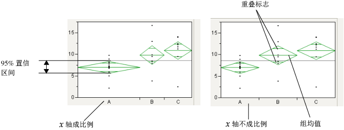 。若一个菱形中的重叠标志与另一菱形中的重叠标志相比更接近该菱形的均值,表示这两个组在给定的置信水平上没有差异。