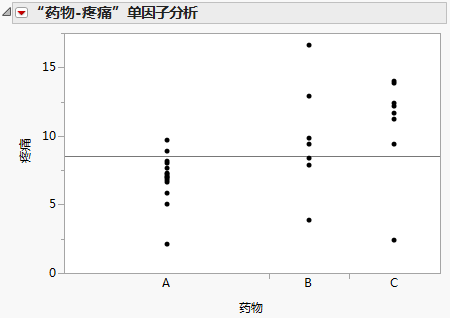 使用“单因子”或“以 X 拟合 Y”平台,您可以了解连续 Y 变量在单一分类 X 变量所定义的各组中分布的差异程度。例如,您可能要了解不同类别的同类型药物 (X) 如何影响患者的疼痛程度(用数字尺度 Y 表示)。