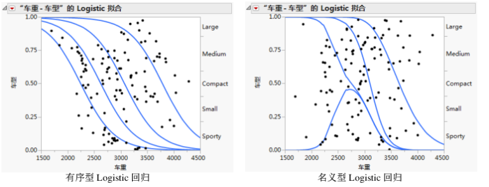 有序型 Logistic 回归为小于或等于给定响应的概率建模。它具有估计单个 Logistic 曲线的效应,曲线进行水平偏移以生成有序类别的概率。该模型更简单,推荐用于有序响应。