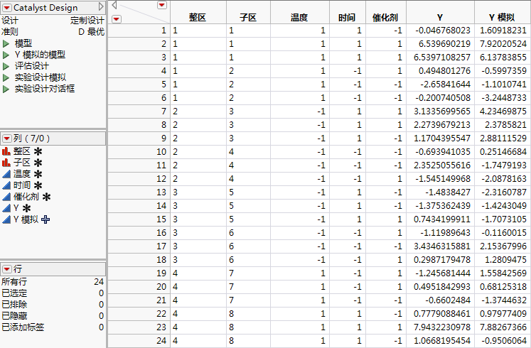 设计表和“模拟响应”窗口随即显示。请注意,该设计表包含一个实验设计模拟脚本。您可以随时运行该脚本以指定不同的参数值。
