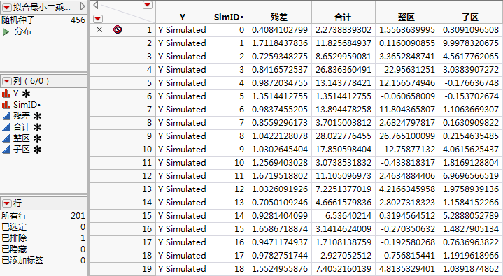 “拟合最小二乘法模拟结果(方差分量)”数据表的第一行包含方差分量的初始值,该行已被排除。其余行包含模拟值。