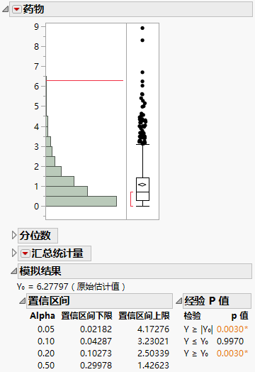 首先,您构造了一个公式,该公式在三种药物之间随机排列疼痛测量值。在“无效”这一原假设下,以上任意分配都与其他任何分配相似。由此判定:以这种方式下获得的 F 比近似原假设下的 F 比的分布。最后,您将 F 比的观测值与模拟获得的零分布进行比较。
