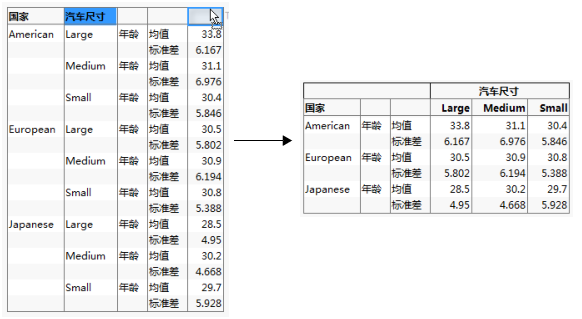 选择“均值”和“标准差”,然后将它们拖放到 Large 标题下方。