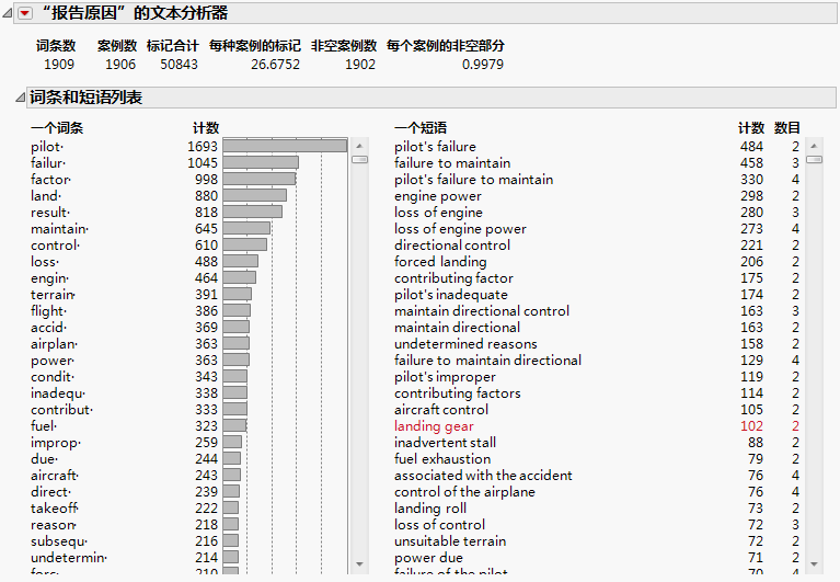 从“报告原因的文本分析器”旁边的红色小三角菜单,选择潜在语义分析,SVD。 |