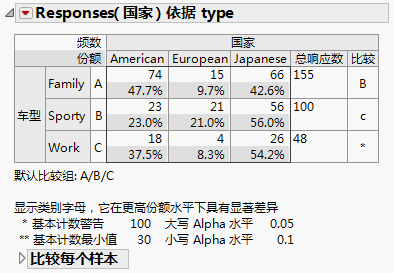 若两个样本水平存在显著差异,响应份额较小的样本水平的字母会被添加到另一个水平的比较单元格中。与小写字母相比,大写字母指示水平间存在更大的差异。大写字母的默认 alpha 水平(显著性水平)为 0.05,小写字母的默认 alpha 水平为 0.10。在图 3.5中,B 指示在 0.05 这个显著性水平下,Sporty(运动型)和 Family(家用型)轿车的原产国有差异。B 位于 Family 轿车这一行中,这是因为 Family 轿车的总响应数 (155) 大于 Sporty 轿车的总响应数 (100)。c 位于 Sporty 行中,这指示在比较 Sporty 和 Work(工作用车)轿车时,在 0.10 水平下两种车型的原产国之间有差异。c 位于 Sporty 行中,这是因为其总响应数 (100) 大于 Work 轿车的总响应数 (48)。