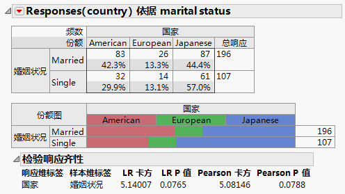 本例使用 Car Poll.jmp 样本数据表,其中包含汽车的相关调查数据。数据中包括有关调查的个人的人口统计信息以及他们所拥有的轿车的信息。您想要了解婚姻状况与轿车原产地之间的关系。还想要检验响应齐性。也就是说,您想要通过检验来判定轿车原产地的分布针对已婚和单身响应者来说分布是否相同。
