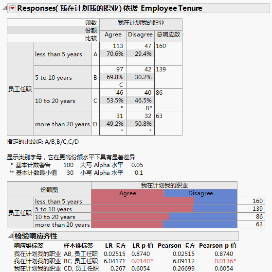 响应齐性检验比较组 A 与 B、组 B 与 C、组 C 与 D。组 B(5 到 10 年)同意“我在计划我的职业”的这一陈述的次数比组 C(10 到 20 年)多。由于 Pearson p 值为 0.0136,所以一致性比率在统计上存在显著差异。
