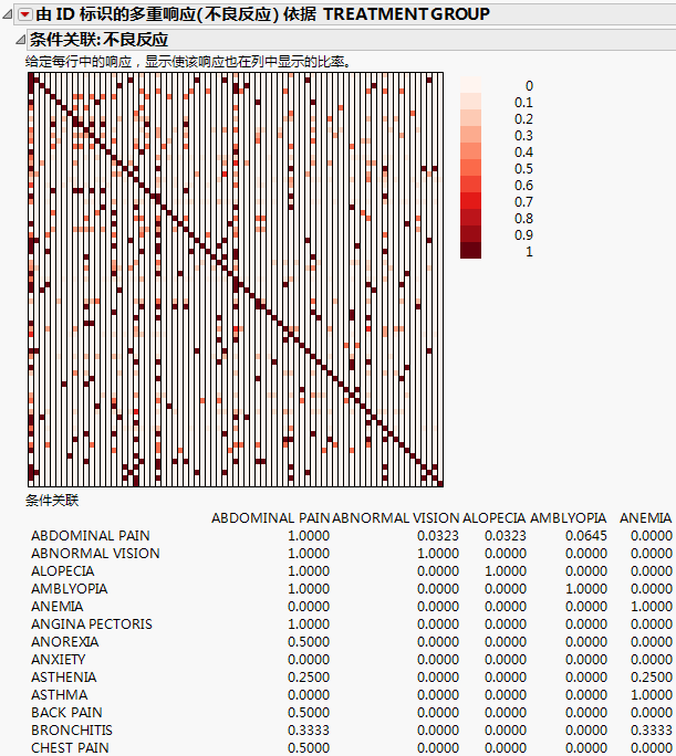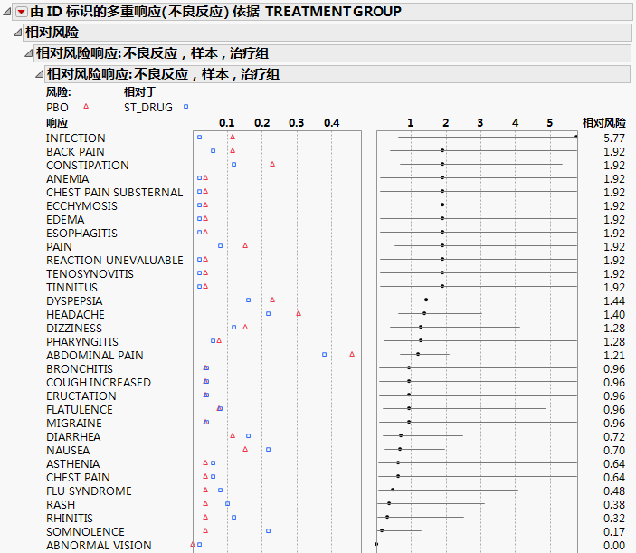 本例使用 AdverseR.jmp 样本数据表,其中包含来自临床试验的不良反应。使用该数据可探索不良事件的条件关联,之后探索与控制组比照后的治疗组中事件的相对风险。
