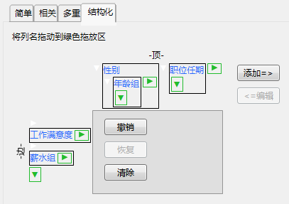 “结构化”选项卡报表包含您在“结构化”选项卡中指定的表。响应齐性检验针对每一种分组变量组合。我们可以看到,对于男性,各年龄组的工作满意度没有差别(Pearson p 值 = 0.9703)。对于女性,各年龄组的工作满意度有差别(Pearson p 值 = 0.0149)。中年女性往往对其工作最不满意。可将份额图和频数图添加到报表中,用来形象演示结果。
