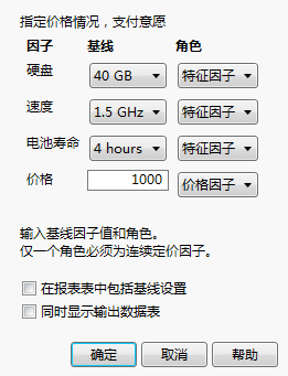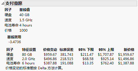 支付意愿一词是指客户愿意为新功能支付的价格,计算该价格以匹配客户的基准功能效用。例如,假定客户愿意为配有 40 GB 硬盘驱动器的计算机支付 $1,000。通过将硬盘驱动器功能设置为 80 GB,再求解提供与 $1000 40 GB 硬盘驱动器相同效用的价格,即可计算 80 GB 硬盘驱动器的支付意愿。