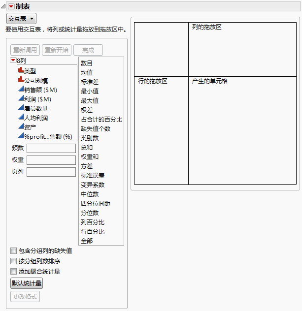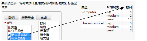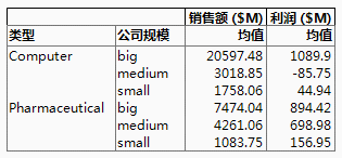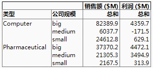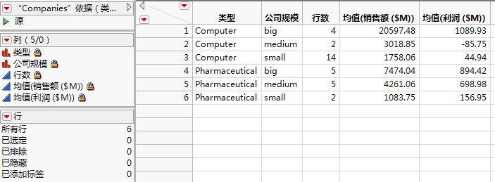 行数列显示原始表中对应于分组变量每个组合的行数。例如,原始数据表包含 14 行对应于小型计算机公司。