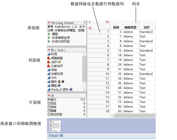 数据网格包含按行和列排列的数据。通常情况下,数据网格中的每一行是一个观测,列(也称为变量)提供关于观测的信息。在图 2.4 中,每行对应一个检验对象,共有十二列信息。尽管数据网格中不能显示全部十二列,但“列”面板会将它们全部列出。每个检验对象的信息包括时间、细胞类型、治疗等。每列包含一个标题或名称。该名称不算在表的总行数中。