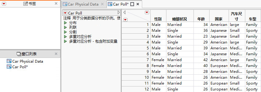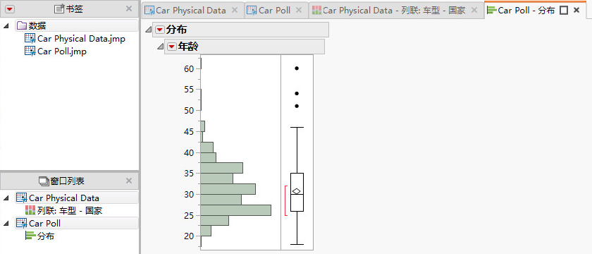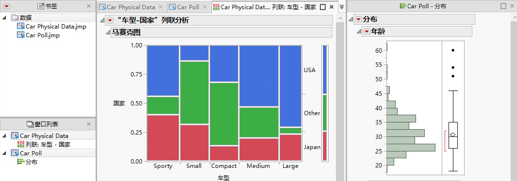 在 Car Poll.jmp 中,运行“分布”脚本。