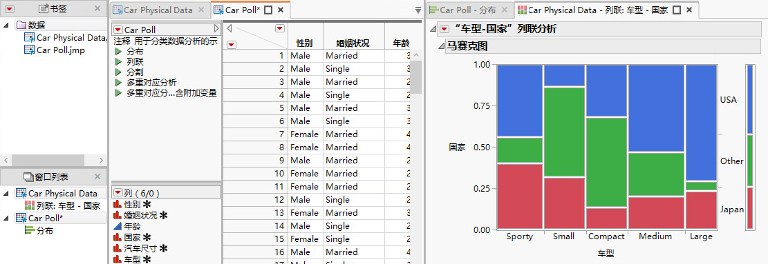 在 Car Physical Data.jmp 中,运行“列联”脚本。
