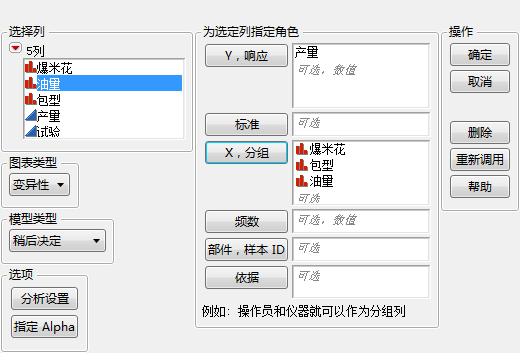 本示例使用 Popcorn.jmp 数据表,数据由爆米花制造商提供。产量(指定数据的玉米粒产出的爆米花数量)根据爆米花类型、包型大小和所用油量的每个组合进行测量。