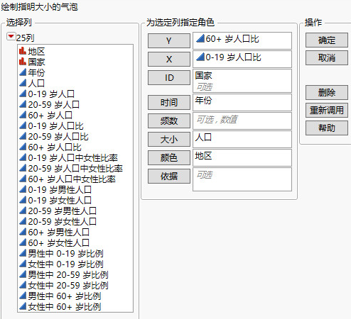 本示例使用 PopAgeGroup.jmp 数据表,表中包含 116 个国家或地区从 1950 年到 2004 年的人口统计数据。总人口数按年龄组划分,不是每个国家每年都有数据。