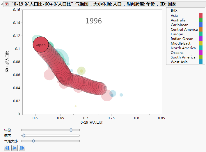 “颜色”变量的每个唯一水平由气泡的颜色表示。在本示例中,表示位于同一地区的不同国家的所有气泡都是相同的颜色。图 4.36 中显示的气泡图颜色是 JMP 默认颜色。