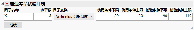 检验条件下限和上限定义设计中加速因子的端点。初始候选项将使用检验条件下限和上限之间等间距的水平。您可以在构造设计之前调整水平。