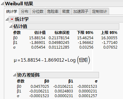 均值模型在“估计值”分级显示项中提供。“估计值”列包含截距 (β0)、线性系数 (β1) 和尺度 (σ) 的参数估计值。参数估计值的估计方差和协方差在“协方差矩阵”分级显示项中提供。构造 ALT 设计时,将这些参数估计值及其协方差用作您的先验值。