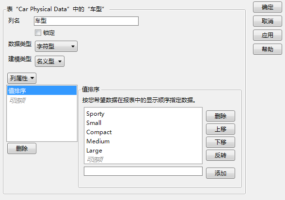 值的报表按以下顺序放置这些水平:Sporty、Small、Compact、Medium 和 Large。使用“值排序”列表右侧的按钮可指定您希望的值顺序。