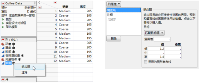 本附录中所述的一些列属性在一般建模情形中很有用。要在更一般的情况下使用这些属性,您可以自行指定它们。当您的设计尚未由实验设计平台创建时,这个功能特别有用。本附录中的一些示例演示了您自行添加列属性的情形。