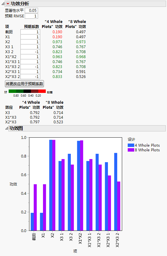 “功效分析”报表显示:整区因子 X1 的功效对于 4 个整区设计 (0.19) 比起对于 8 个整区设计 (0.497) 要小得多。不过,4 个整区设计检测裂区效应的功效较高,特别是两个裂区因子的交互作用 X2*X3(0.797 对比 0.523)。请注意,色条和图例下面给出了组合效应 X2*X3 的功效。