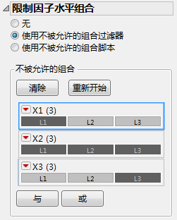 “设计”分级显示项下的注释指出由于存在约束导致一次试验包含缺失设置。该试验是第 9 次试验。要确保覆盖阵列具有强度 2,需要 X1 设置为 L1 且 X3 设置为 L3 的组合。但是对于这些设置,这些约束阻止了 X2 的所有设置。