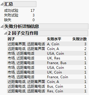 “双因子交互作用”报表显示可能引起三次失败的组合。有可能是