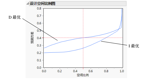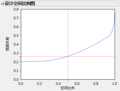 “设计空间比例图”显示在图 5.44的左侧。当“空间比例”为 0.95 时,蓝色曲线的垂直坐标约为 0.5。这意味着对于大约 95% 的设计空间,相对预测方差低于误差方差的 50%。