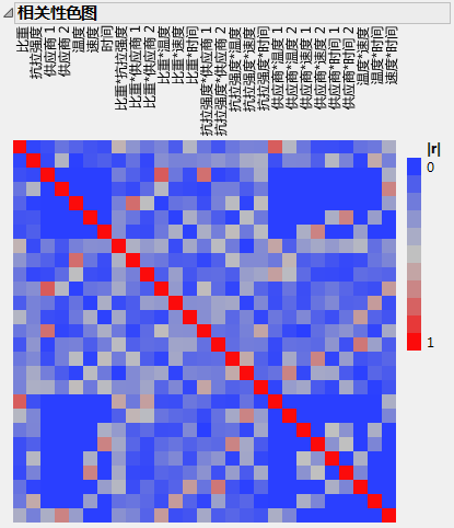 与主效应对应的七项显示在色图左上角。请注意,这七项接近正交。最大绝对相关性出现在抗拉强度与供应商 2 之间。这个大约 0.43 的绝对相关性是可用协变量值所带来的结果。(图 5.64使用 JMP 默认颜色。)