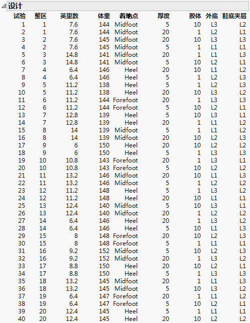 在本例中,您需要构造一种设计,为选手级跑步者开发一款具有耐磨(损耗)特点的跑鞋。实验包括以下因子: