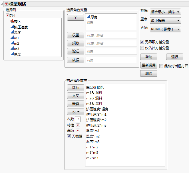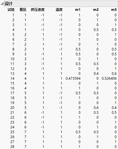 该样本数据表包含 28 次试验和响应值。在该表中,您使用“定制设计”平台创建的设计设置不同于 Vinyl Data.jmp 设计中使用的设置。