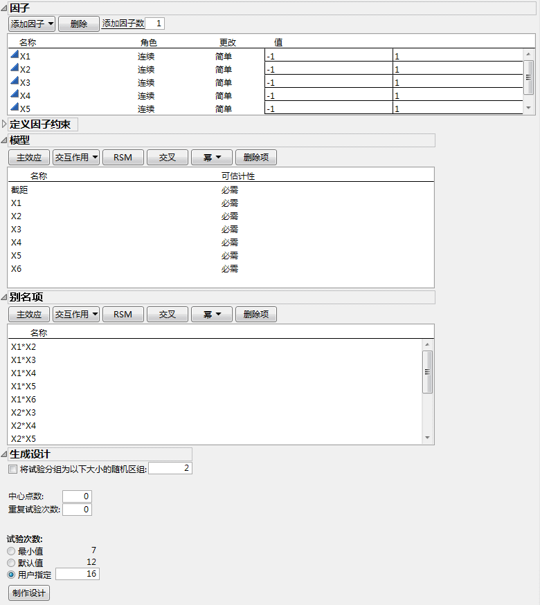 在本例中,您需要在仅限主效应的 8 次试验设计(请参见仅估计主效应的设计)与能够拟合所有双因子交互作用的 22 次试验设计之间作出取舍。您将“别名最优性”用作实现目标的最优性准则。