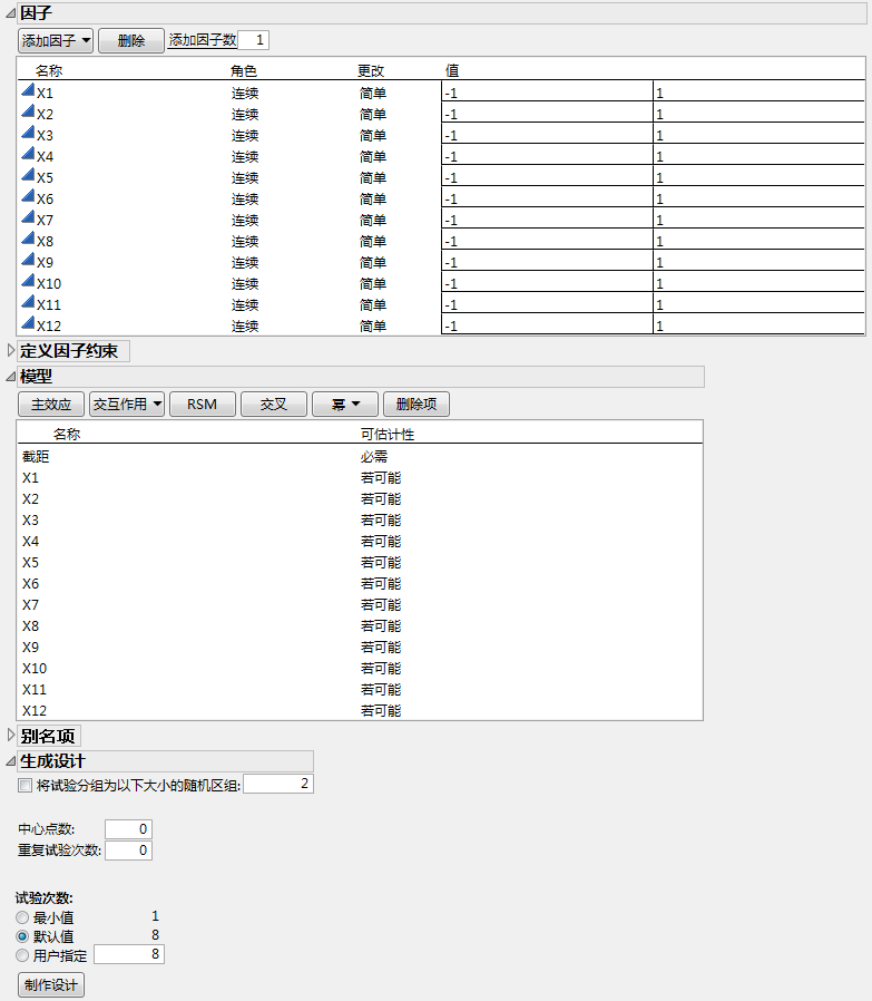 若实验中的活跃因子个数超过了试验次数的一半,则这些因子可能无法识别。一般规则是:试验次数应至少是活跃因子个数的四倍之多。换言之:若您预计活跃因子可能多达五个,那么应计划执行至少 20 次试验。