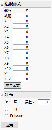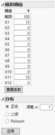 响应列 Y 和 Y 模拟的初始值具有相同的模拟值。这些值是来自 N(0, s) 分布 的随机值。其中,s 是来自功效分析对话框的 RMSE,默认值为 1。Y 模拟值随着使用“模拟响应”窗口中的参数值定义的模型随机生成的值而更新。Y 列专用于运行实验后的真实响应。