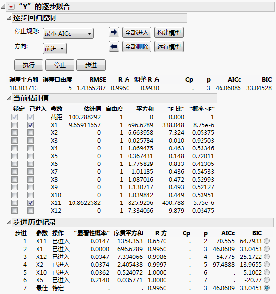 逐步回归是另一种标识活跃因子的方式。图 5.16中的设计表包含三个脚本。“模型”脚本使用“拟合模型”平台中的逐步回归分析数据。