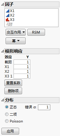 模拟正态分布中的值。为误差 σ(正态误差分布的标准差)输入一个值。若您已在“因子”分级显示项中指定因子“更改”值为“困难”,则可以为整区 σ(整区误差)输入一个值。若您已指定因子的“更改”值为“困难”和“极难”,则可以为同时为子区和整区误差输入值。点击“应用”后,随机值和包含基于模型的随机响应向量的公式将输入列 <Y> 模拟中。