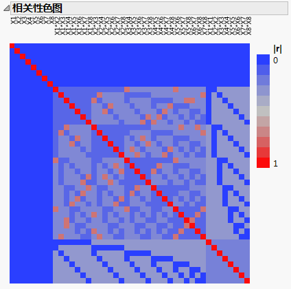 图 7.23为包含八个连续因子的设计显示了相关性色图,如图 7.22所示。该色图针对完全二次设计。八个纯二次效应列在最右侧。通过使用“实验设计”>“设计诊断”>“评估设计”并在“别名项”列表中输入适当的项,您可以构造该图。详细信息,请参见“评估设计”一章中第 396 页的“别名项”。