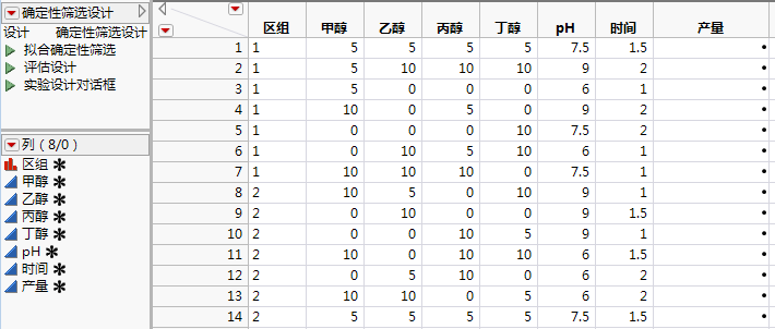 萃取因子及其设置在数据表 Extraction Factors.jmp 中提供。按如下方式生成包含区组的确定性筛选设计。