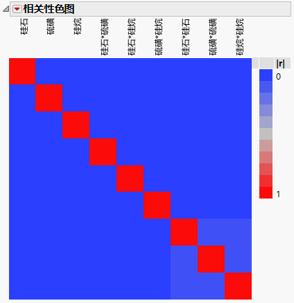 默认情况下,相关性的绝对大小用蓝色-灰色-红色强度颜色主题表示。通常来说,优秀设计的色图显示对角线外有很多蓝色,这表示不同项之间是正交的或相关性很小。效应之间的绝对相关性很大会导致估计值的标准误差膨胀。