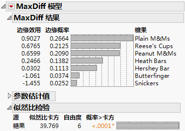 该比较报表指示哪些糖果类型对在效用上有显著差异。每个单元格中的第三个条目是由行项的效用减列项的效用定义的差值的 p 值。p 值颜色的强度指示差值的显著程度。蓝色或红色着色指示差值(行 - 列)是正数还是负数。不调整 p 值来控制多重比较误差率,该值只应作为参考。有关“所有水平比较”报表的详细信息,请参见《消费者研究》手册中的“MaxDiff” 。