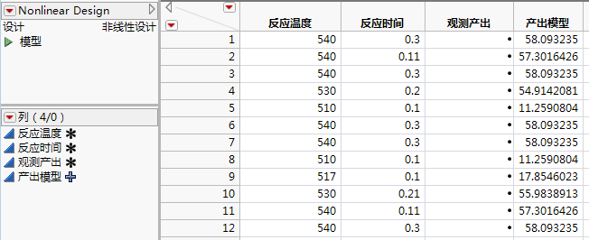 您的设计应与图 23.3中所示的设计类似。试验顺序可能不同,反应温度和反应时间值以及为产量模型计算出的值可能略有不同。请注意,值显示在产量模型列中,因为该列包含模型的公式。还请注意,表包含一个模型脚本,您可以使用它来对观测值拟合非线性模型。