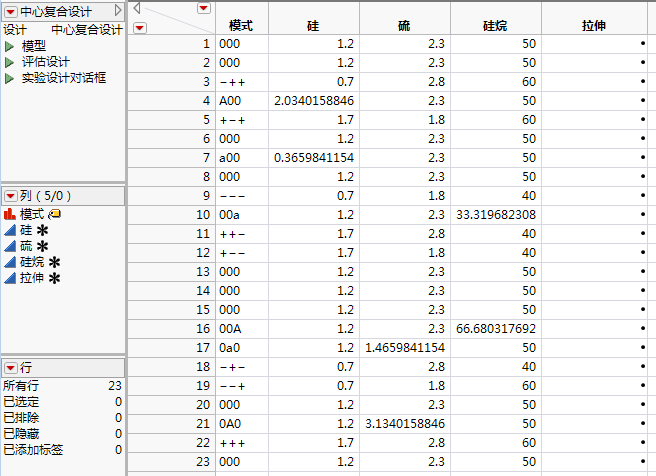 “表”面板中左上角的设计注释给出生成表的设计类型(“中心复合设计”)。若您正在比较多个设计,此信息很有用。